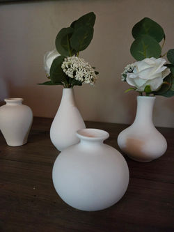 ![]() 159. Bud vases, ceramic white style, variety of shapes. $ 1 ea | ![]() 159a. White bud vases come with white flowers and greenery. $ 1.25 ea |