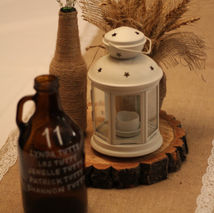 Gold and ivory lantern. Glass flower jug. Birch table numbers. Birch wood cookie.