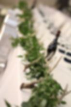 Twine wrapped bottles. Large vase with fairy lights. Wood cookies. Burlap table runner.